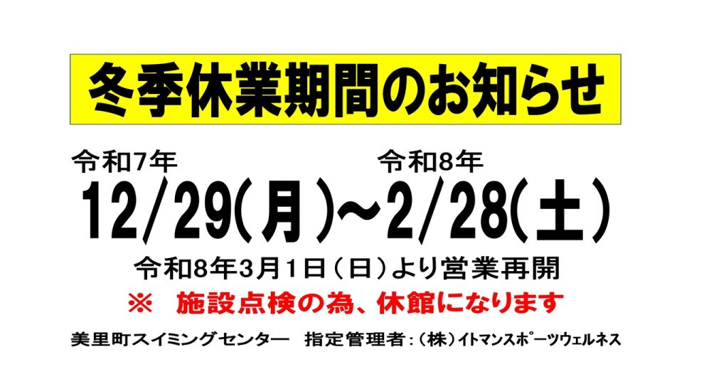 | ◆日曜・祝日 9:00~16:00(入水時間 9:00~15:45) |